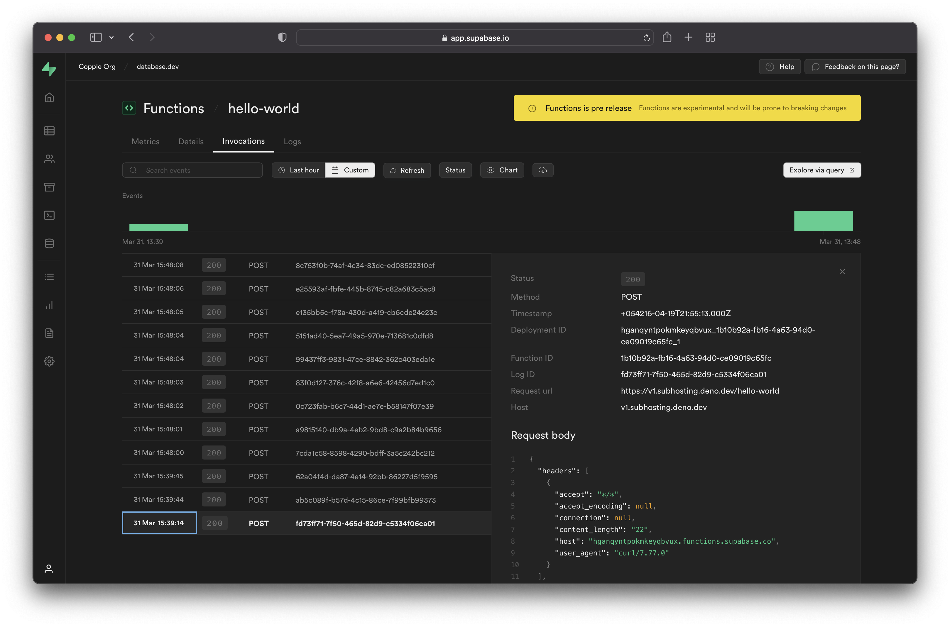 - Invocations: Request/Response data including headers, body, status codes, and execution duration. Filter by date, time, or status code.