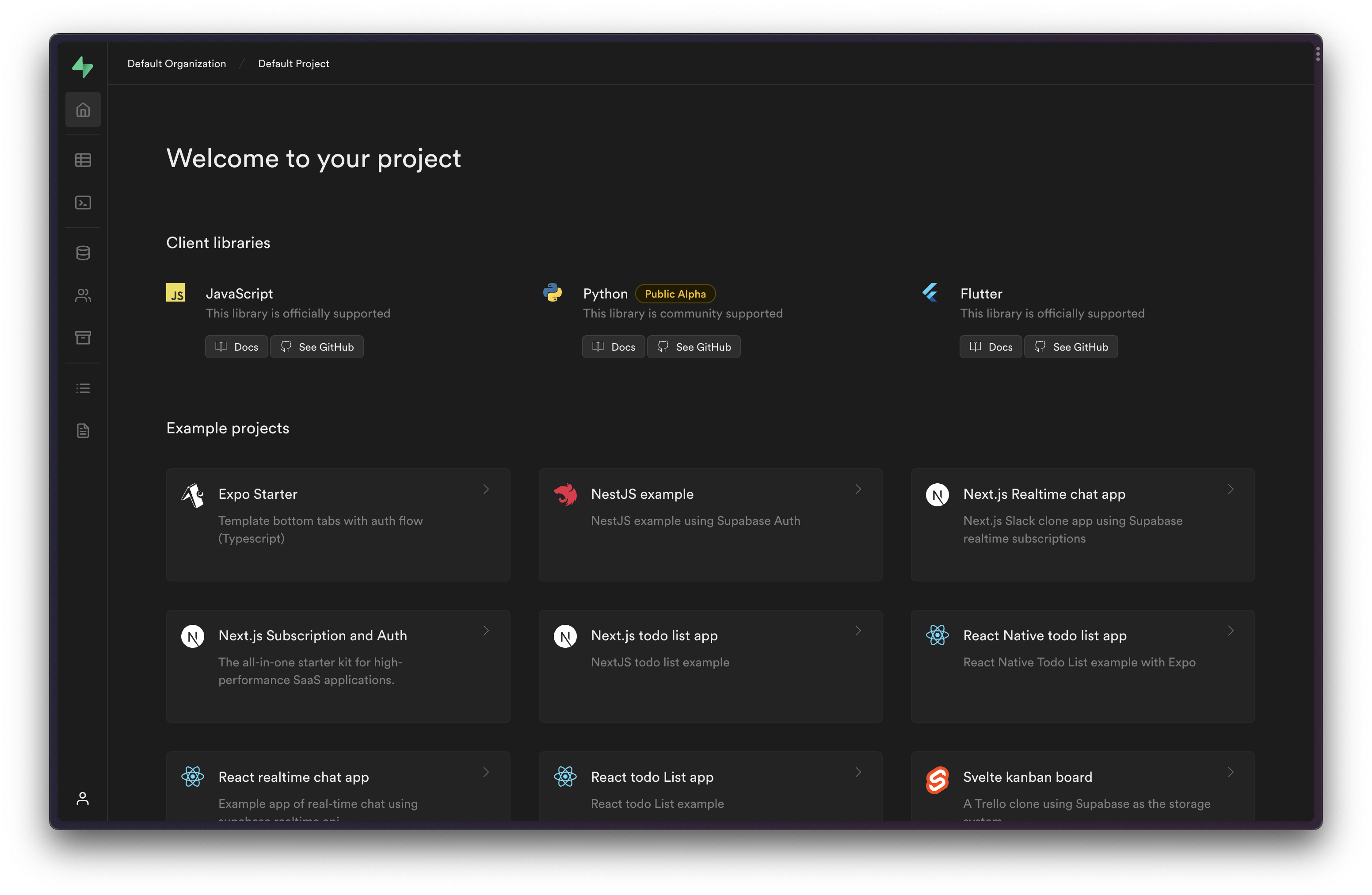 The Supabase CLI enables you to run the entire Supabase stack locally, on your machine or in a CI environment. With just two commands, you can set up and start a new local project: