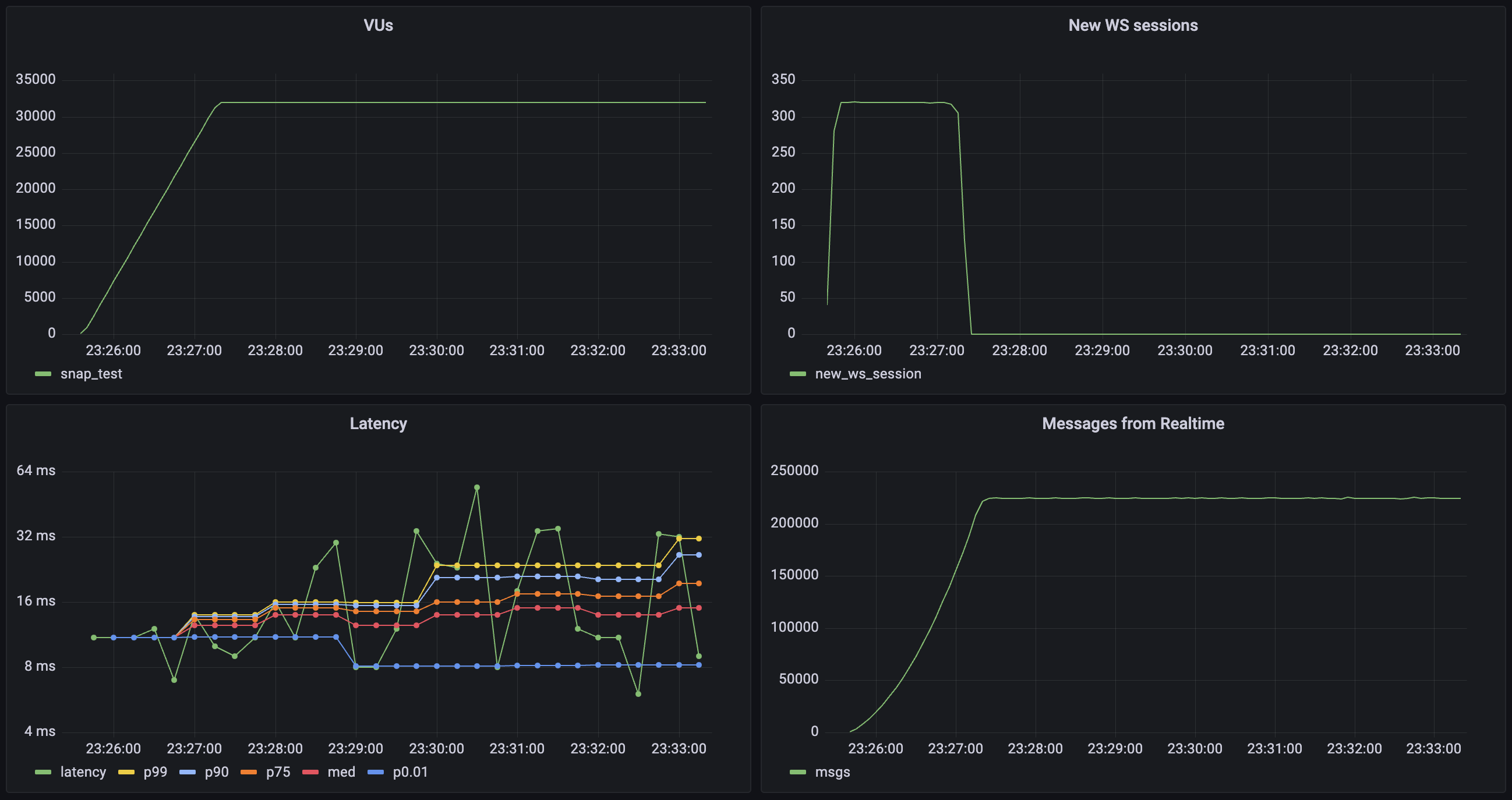 • The benchmarks are conducted using k6, an open-source load testing tool, against a Realtime Cluster deployed on AWS.