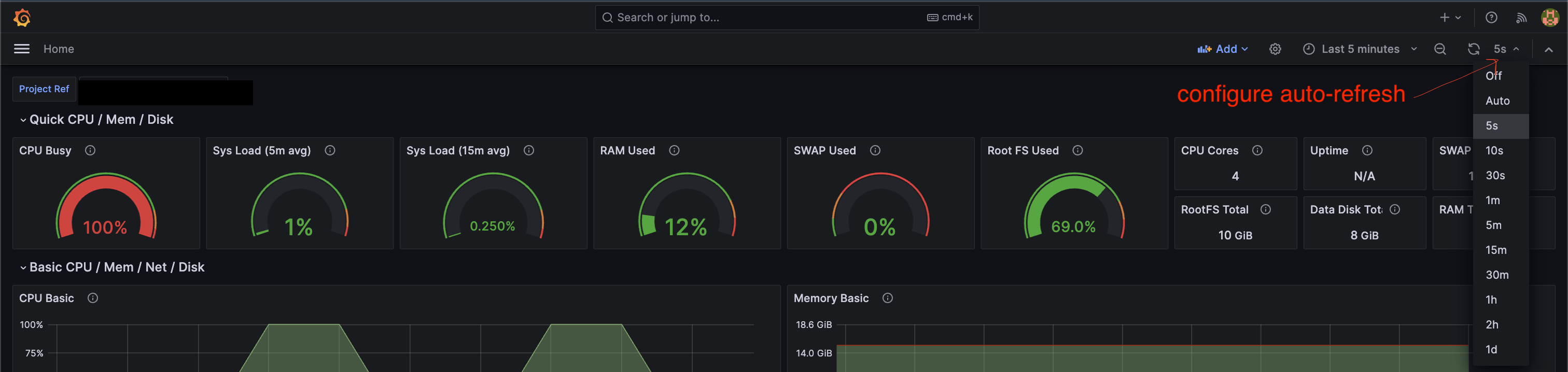 1curl https://<YOUR_PROJECT_REF>.supabase.co/customer/v1/privileged/metrics --user 'service_role:<SECRET_API_KEY>'Step 2: Set your Grafana Dashboard to auto-refresh in the top right corner#