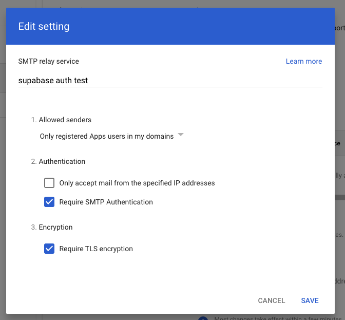 A lot of this was figured out through trial and error. This is unlikely to be a Supabase Auth bug because Supabase Auth uses the native Golang SMTP library . If you still have issues setting up Google SMTP, you can try switching to one of these SMTP providers: