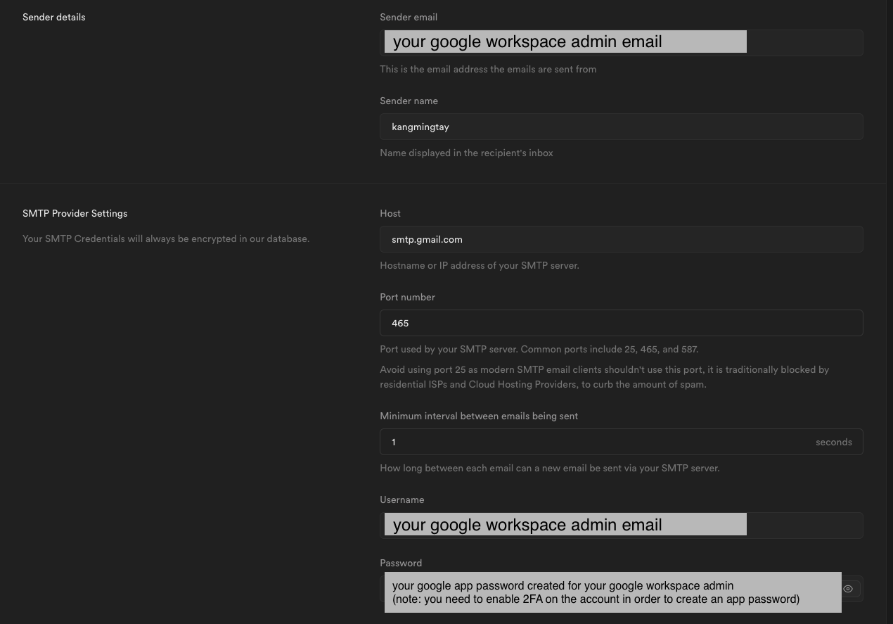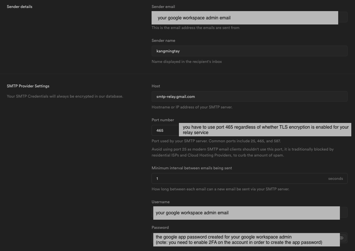 - The SMTP password used has to be an app password. Google workspace doesn't make it easy to to figure out how to create this. You need to enable 2FA on your workspace account first (not inside the admin console but in https://myaccount.google.com/)